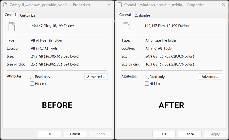 How to reduce the disk space used by any AI application (Forge, ComfyUI, InvokeAI, Fooocus, SwarmUI, Kohya_SS, etc.) on Windows using real-time file compression.